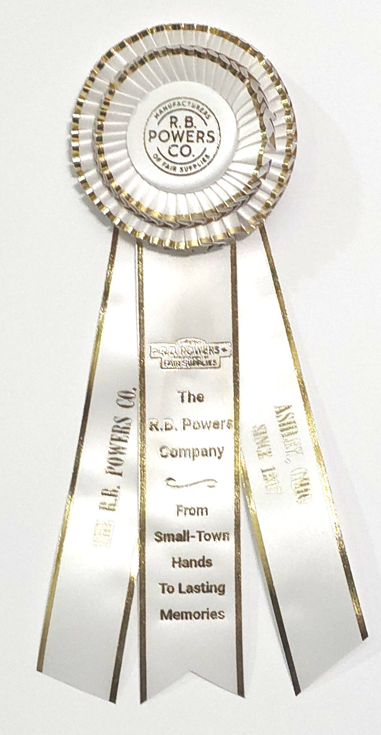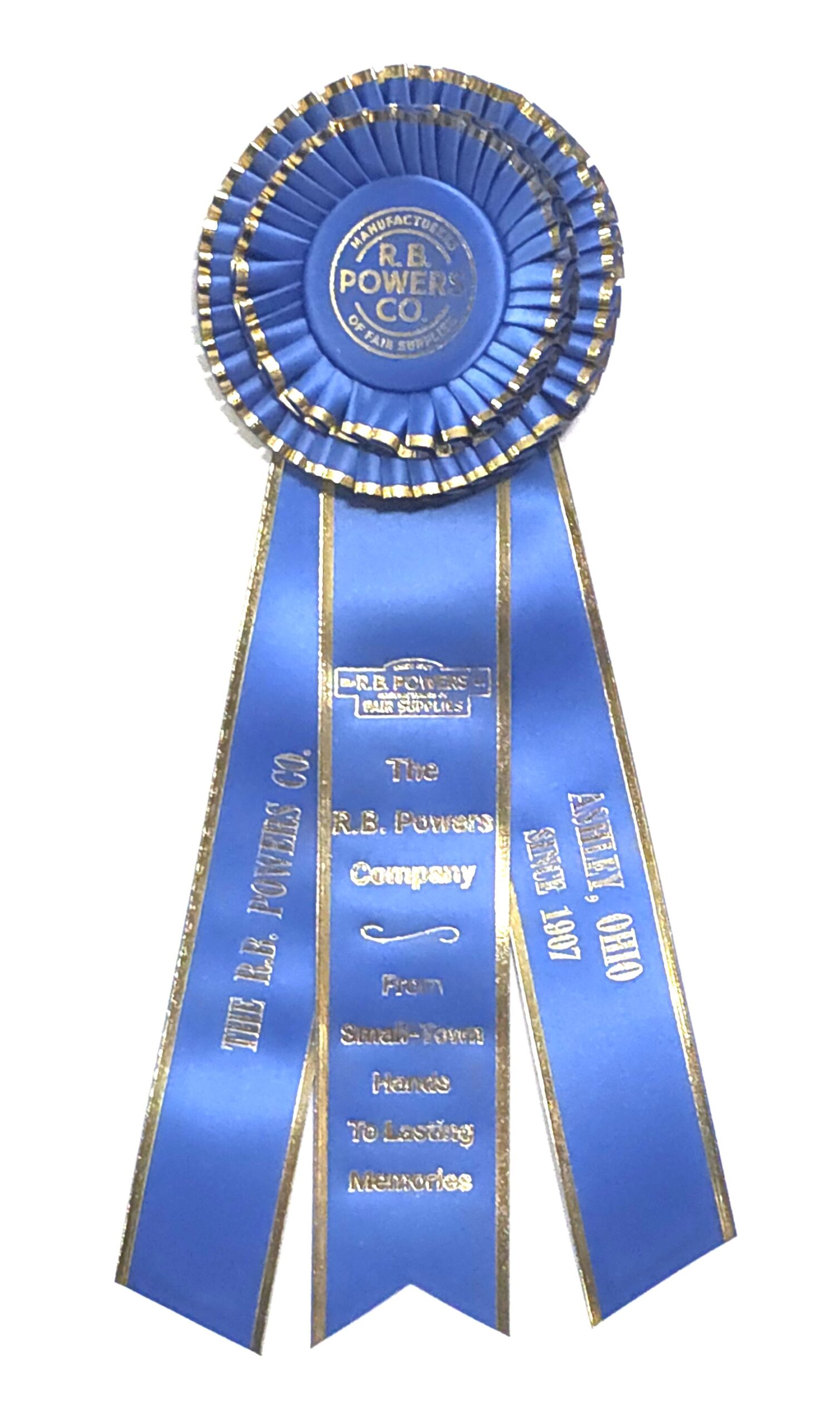 Custom rosette with 4.5″ rosette head and three 2″ x 10″ gold edged streamers. The rosette head has two rows of gold edged quill surrounding the center button. Total length is 13 inches. Your logo (or stock logo of your choice) is printed in the center button.