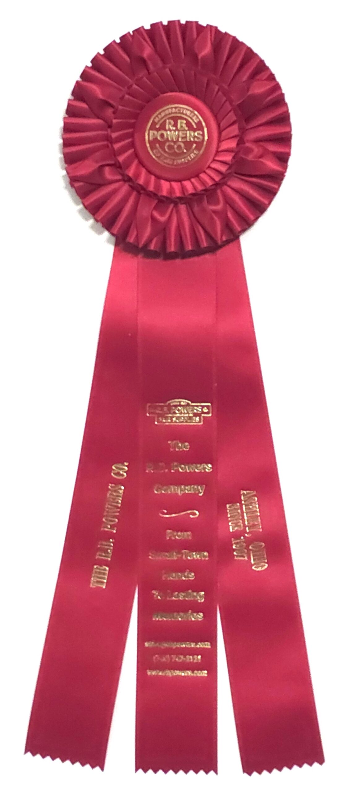 Custom rosette with 5.5″ rosette head and three 2″ x 12″ streamers. The rosette head has an inner row of quills and an outer row of quill overlapped by eight petals, all surrounding the center button. Total length is 18 inches. Your logo (or stock logo of your choice) is printed in the center button.