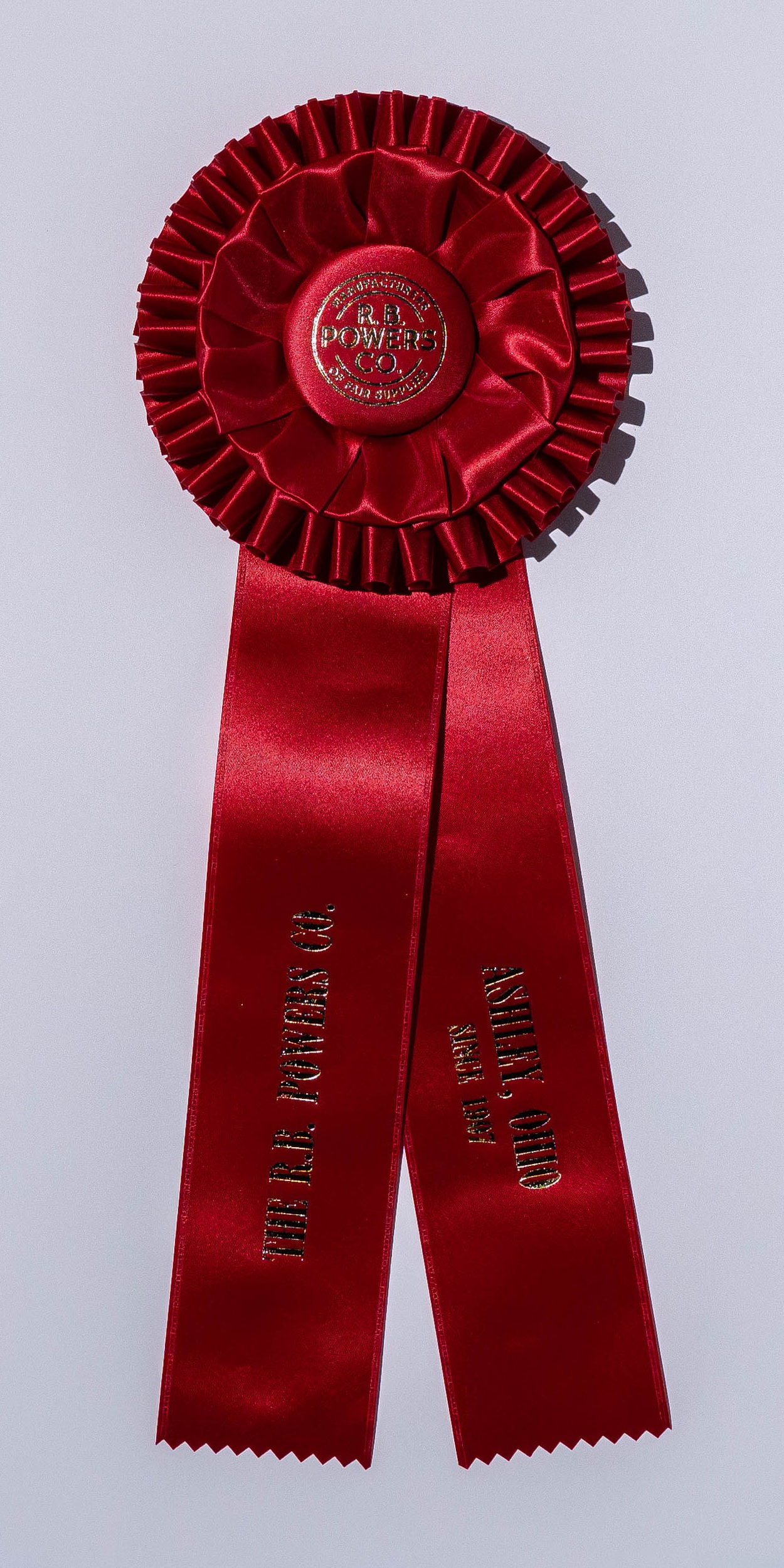 Custom rosette with 5.75″ rosette head and two 2.5″ x 12″ streamers. The rosette head has an inner row of looped ribbons and an outer row of quill, all surrounding the center button. Total length is 16 inches. Your logo (or stock logo of your choice) is printed in the center button.