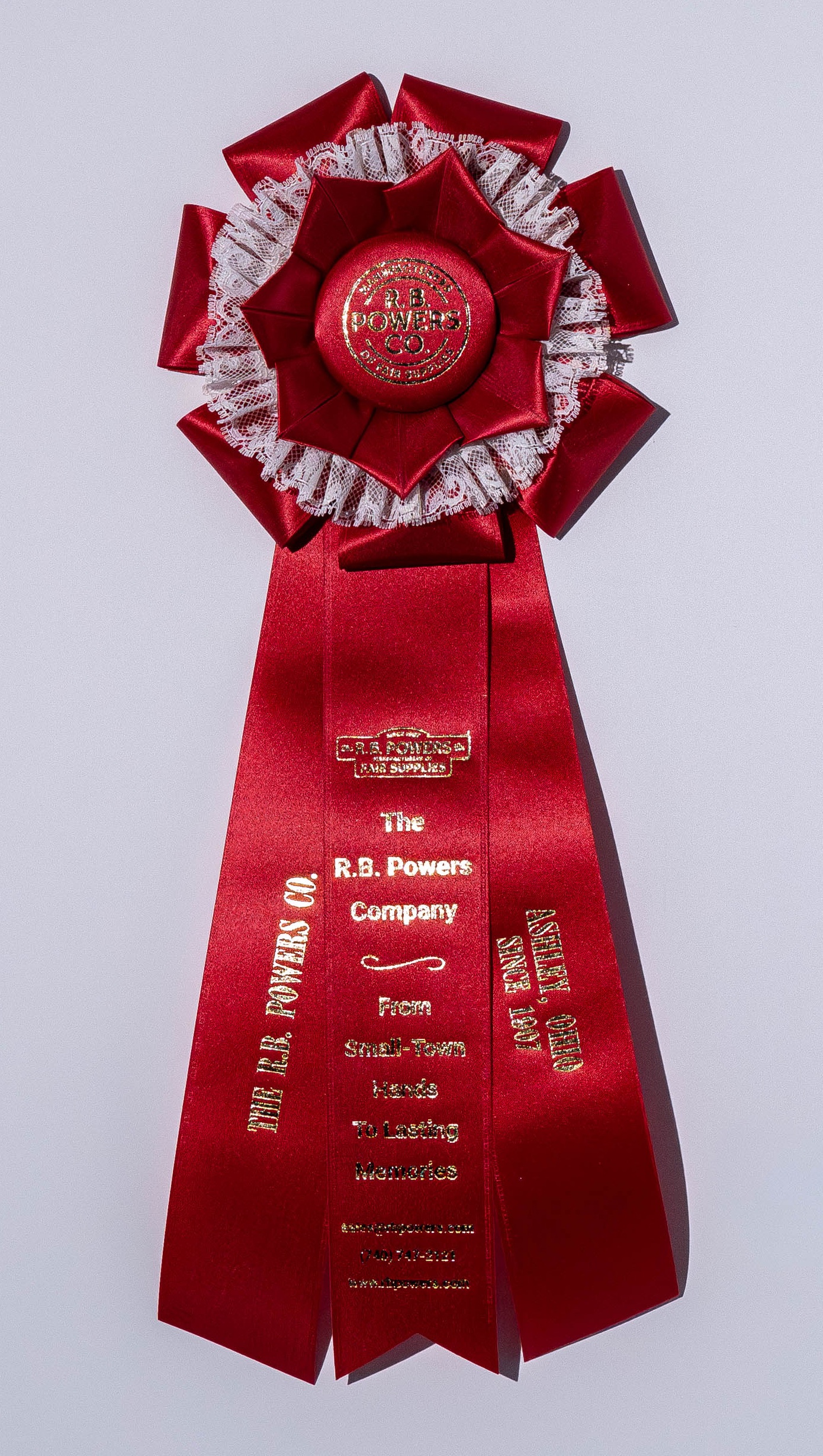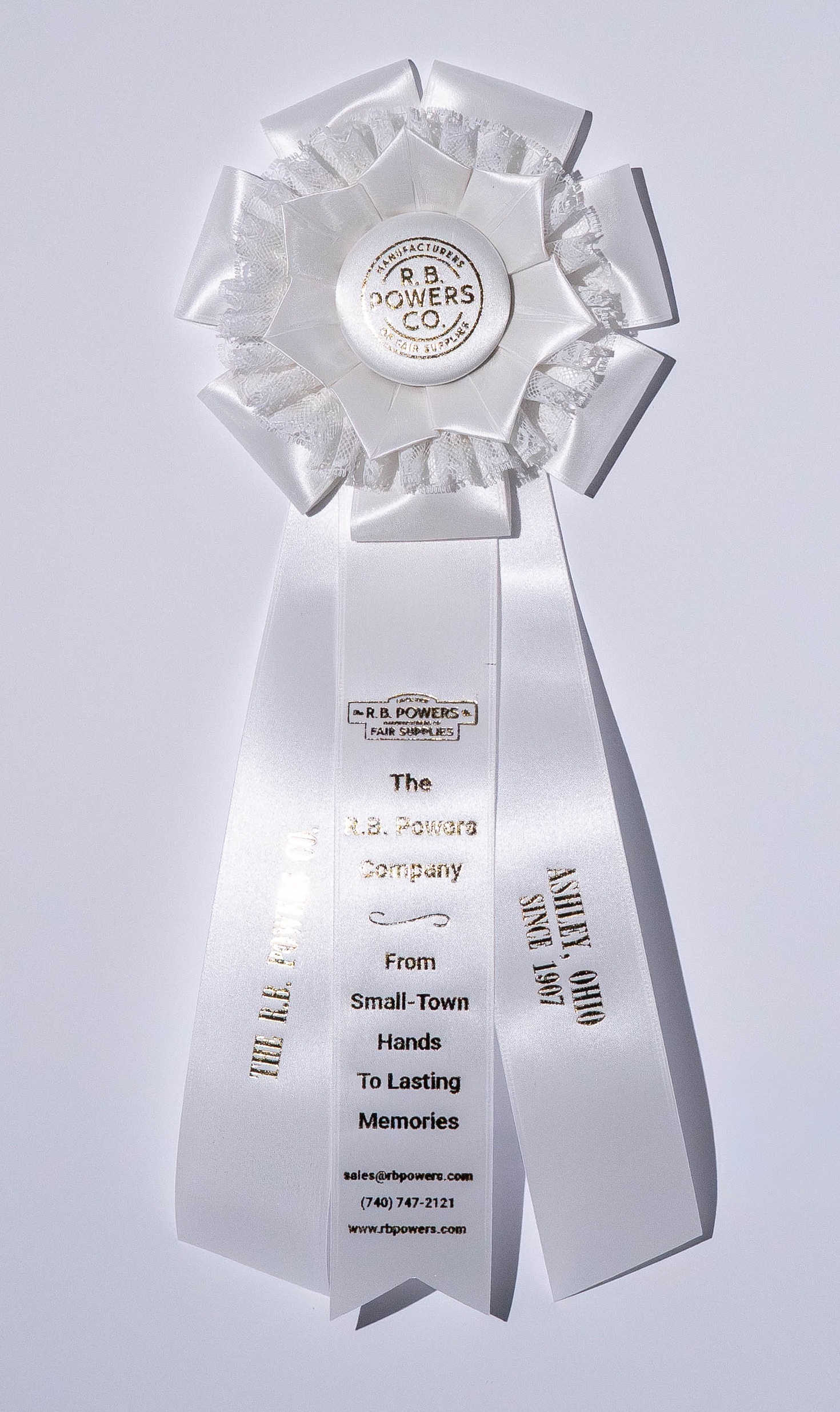 Custom rosette with 6″ rosette head and three 2″ x 12″ streamers. The rosette head has a row of quilled lace, overlapped by seven petals, and an outer row of looped ribbons, all surrounding the center button. Total length is 16 inches. Your logo (or stock logo of your choice) is printed in the center button.