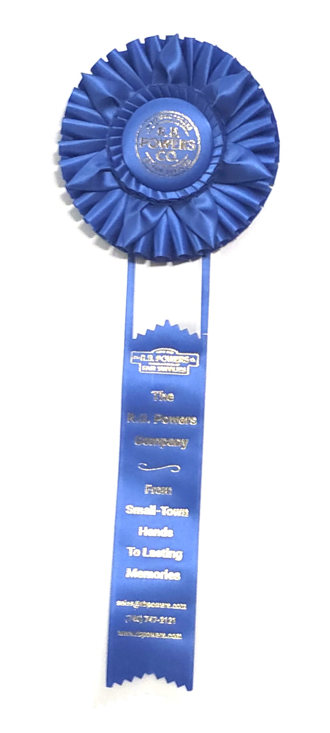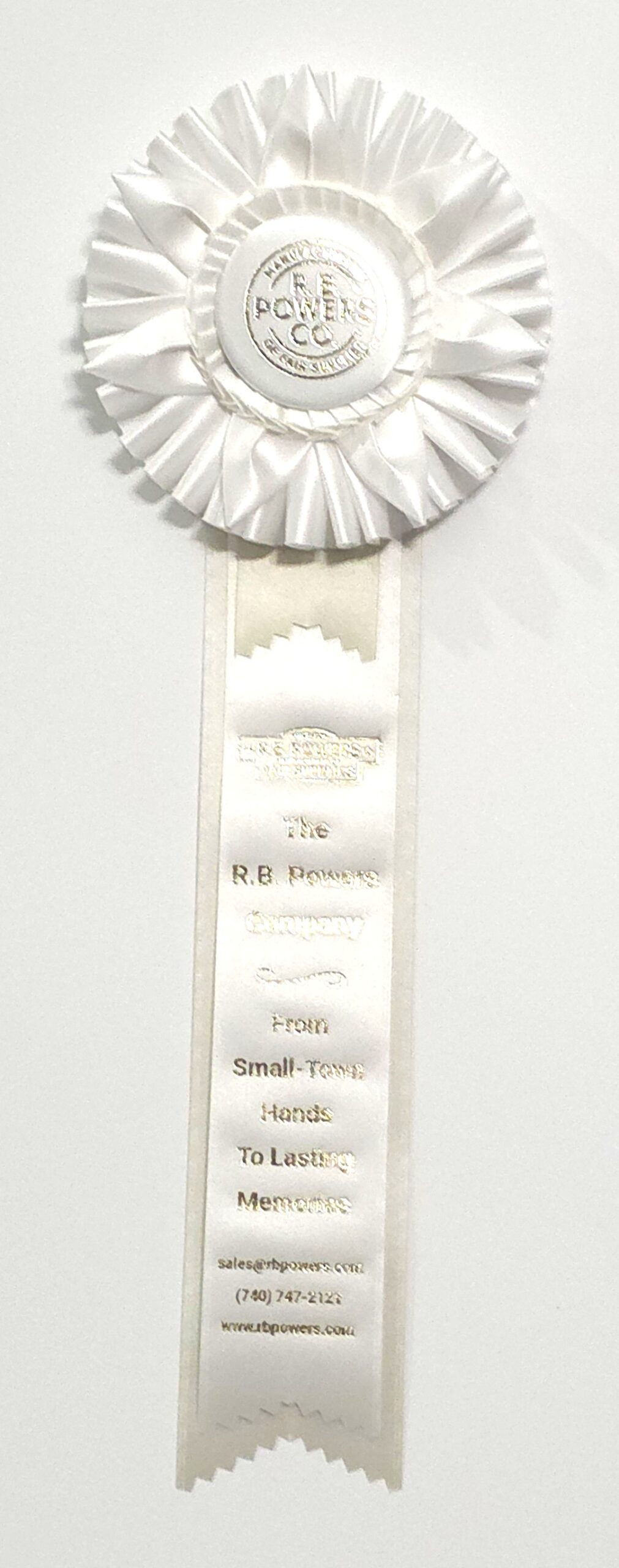 Custom rosette with 5.5″ rosette head and three 2″ x 15″ streamers. The rosette top has a small row of quill and seven petals surrounding the center button, all backed by a larger row of quill. Total length is 19 inches. Your logo (or stock logo of your choice) is printed in the center button.