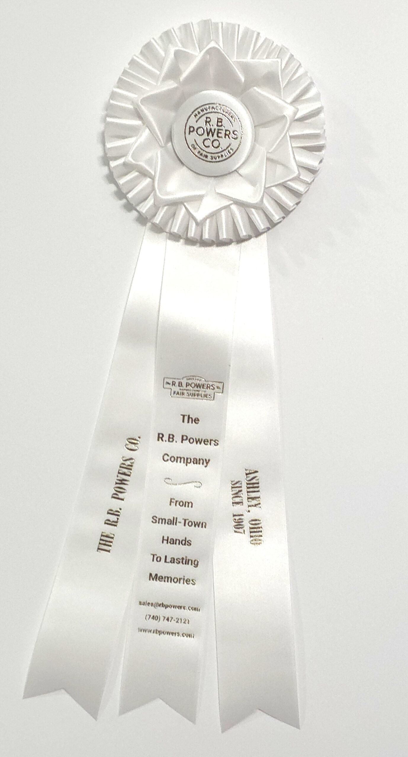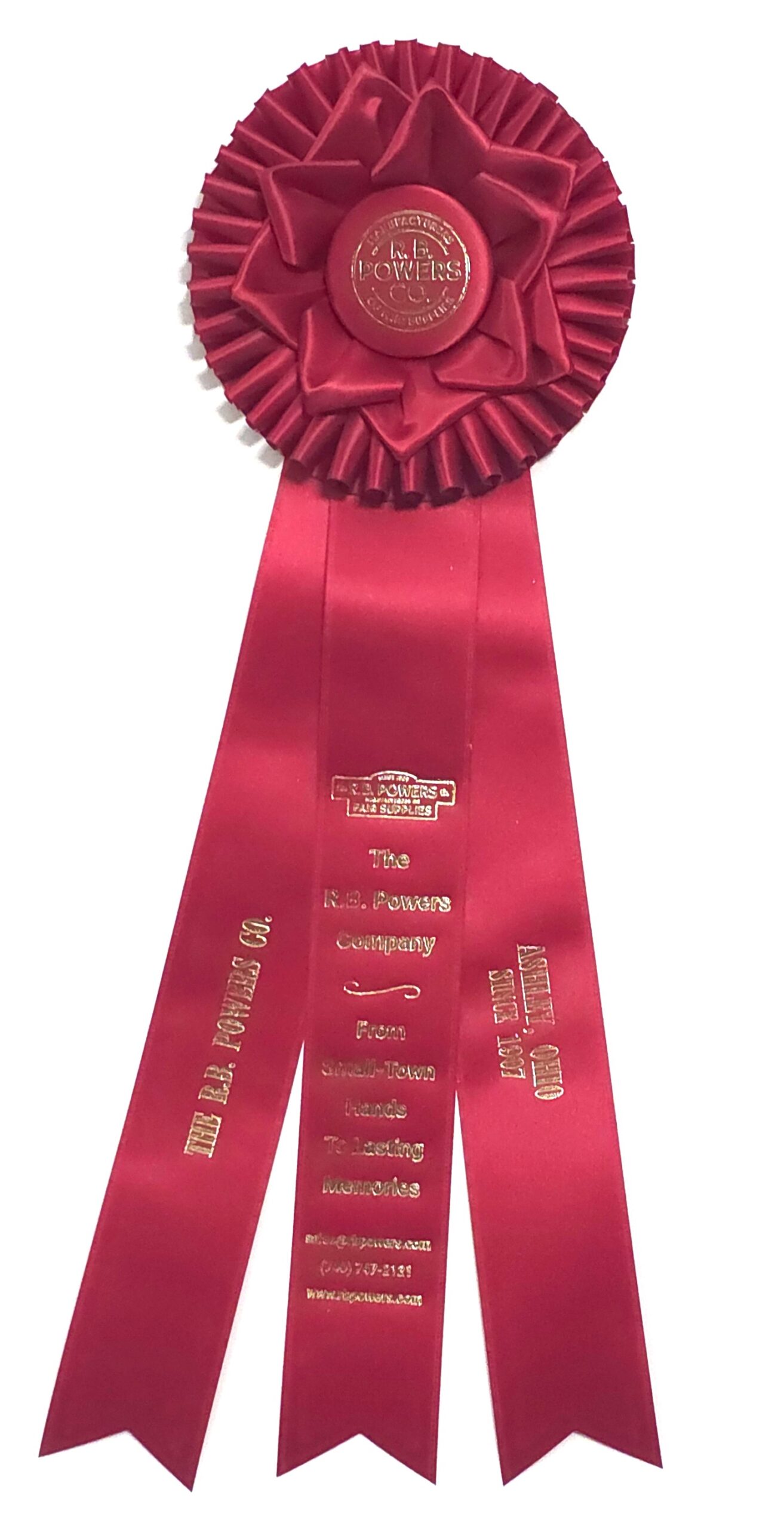 Custom rosette with 5.5″ rosette head and three 2″ x 12″ streamers. The rosette head has a single row of quill, overlapped by two layers of petals, all surrounding the center button. Total length is 18.5 inches. Your logo (or stock logo of your choice) is printed in the center button.