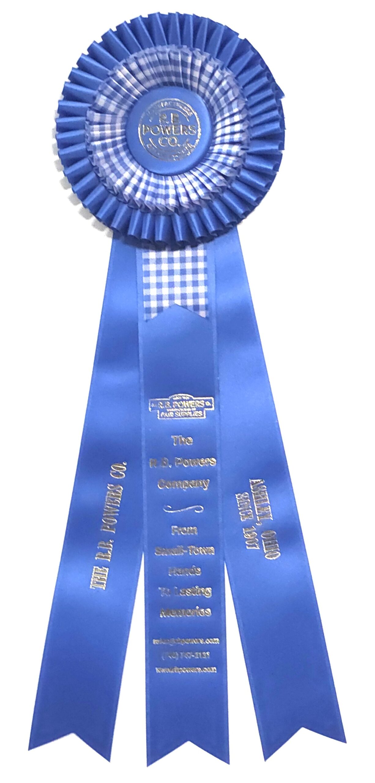 Custom rosette with 5.75″ rosette head and three 2″ x 15″ streamers. The rosette head has two rows of quill surrounding the center button. Total length is 18 inches. Your logo (or stock logo of your choice) is printed in the center button.