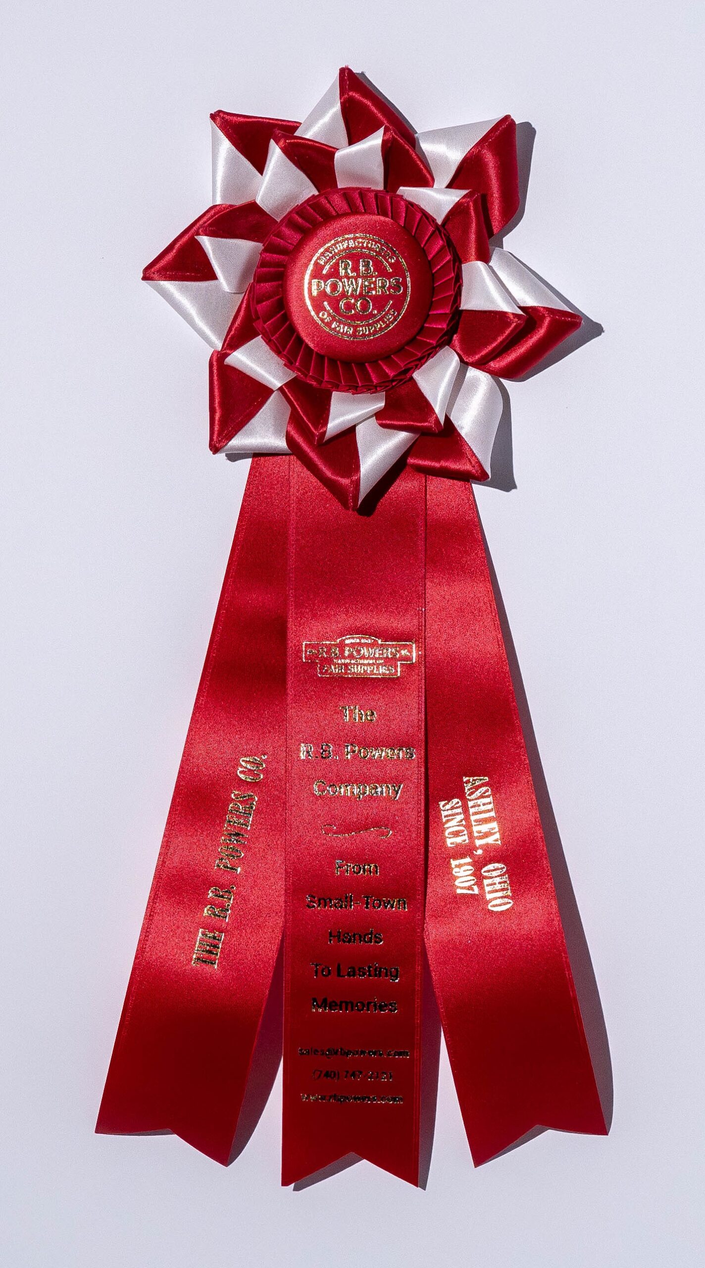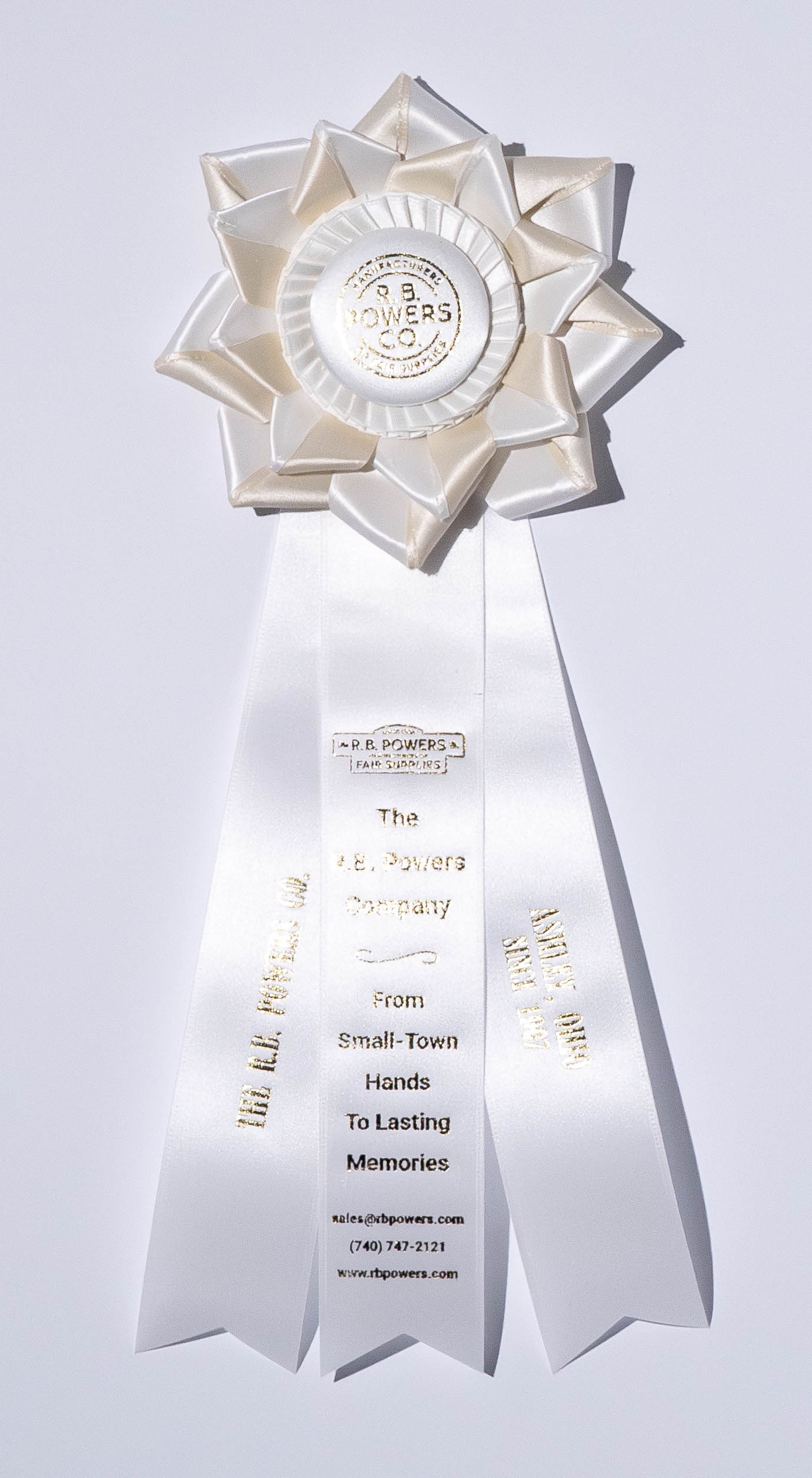 Custom rosette with 6.5″ rosette head and three 2″ x 12″ streamers. The rosette head has an inner row of quill and two outer rows of bi-color petals, all surrounding the center button. Total length is 16 inches. Your logo (or stock logo of your choice) is printed in the center button.