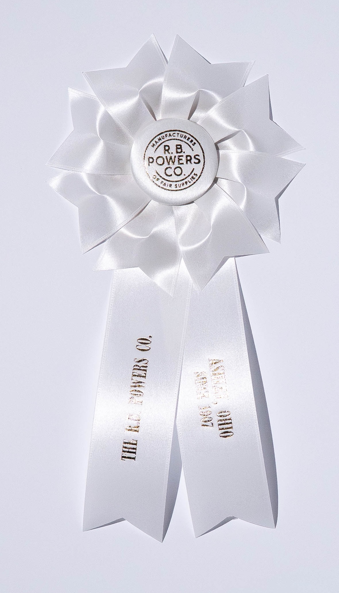 Custom rosette with 5.5″ rosette head and two 2″ x 9″ streamers. The rosette head has a row of petals, overlapped by looped ribbons, all surrounding the center button. Total length is 13 inches. Your logo (or stock logo of your choice) is printed in the center button.