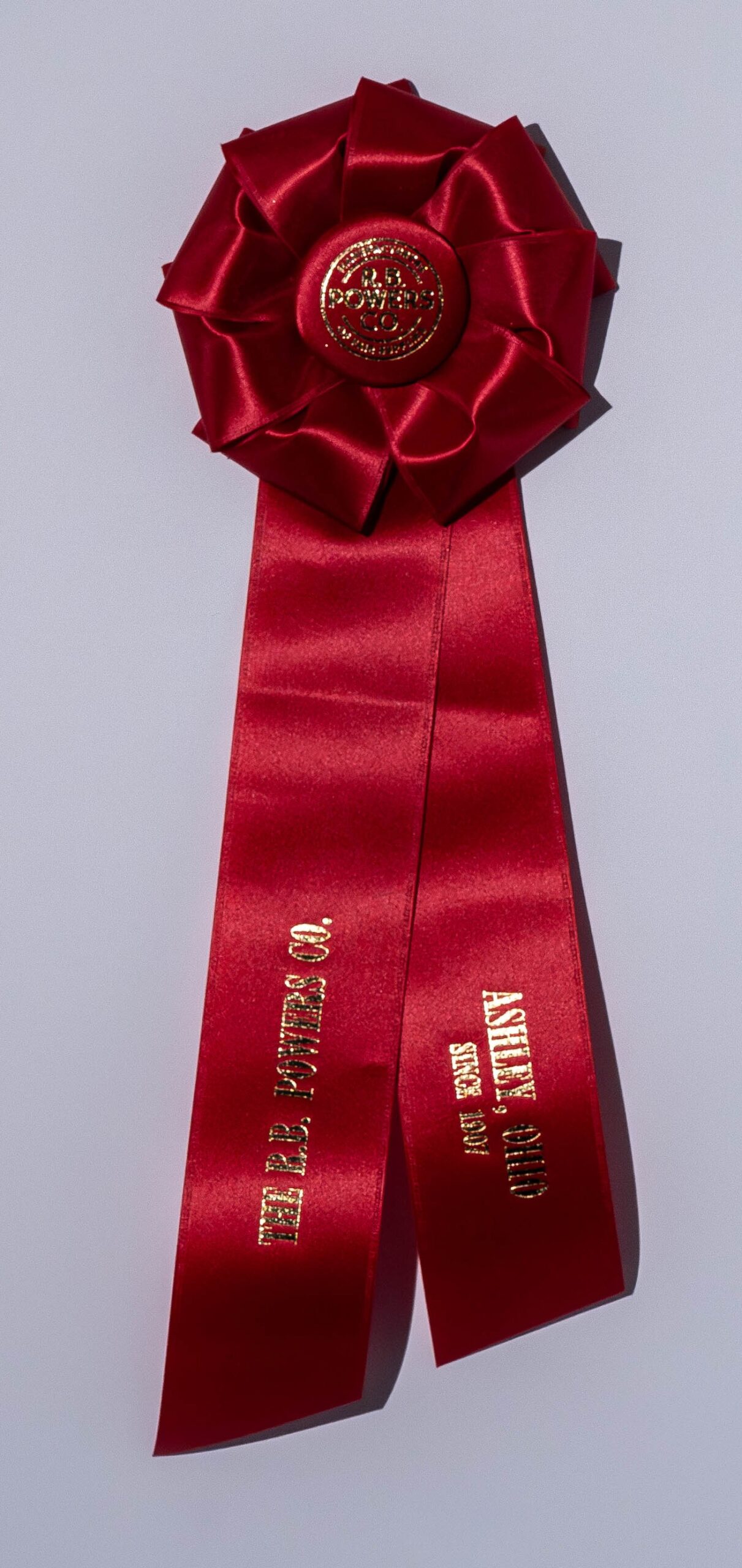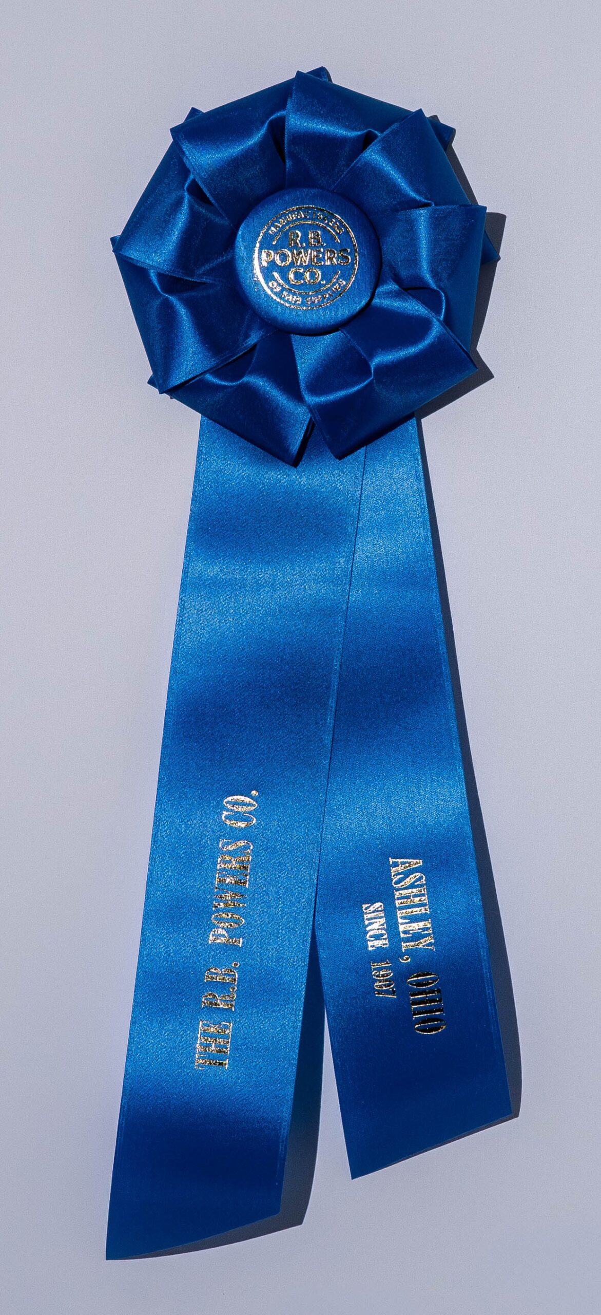 Custom rosette with 6″ rosette head and two 2.5″ x 15″ streamers. The rosette head has a single row of looped ribbons surrounding the center button. Total length is 18.75 inches. Your logo (or stock logo of your choice) is printed in the center button.