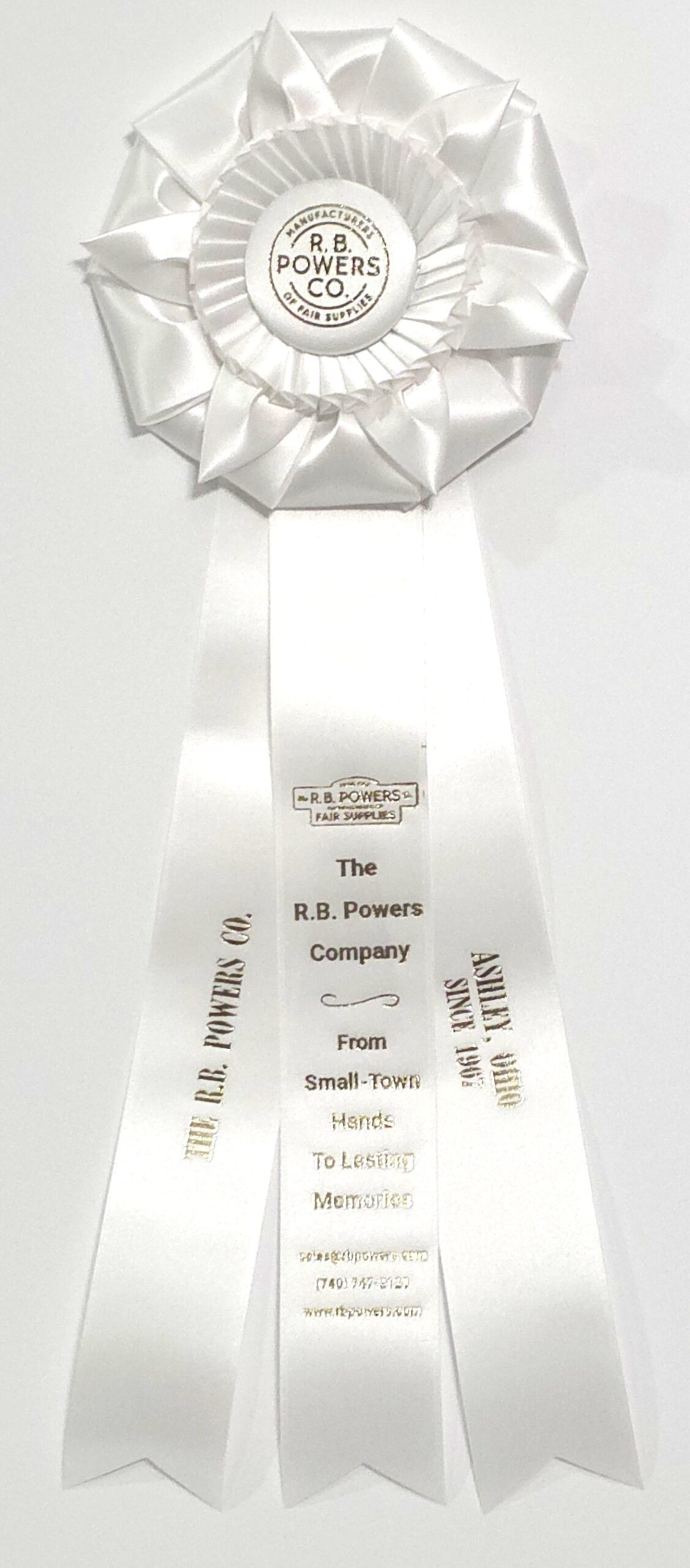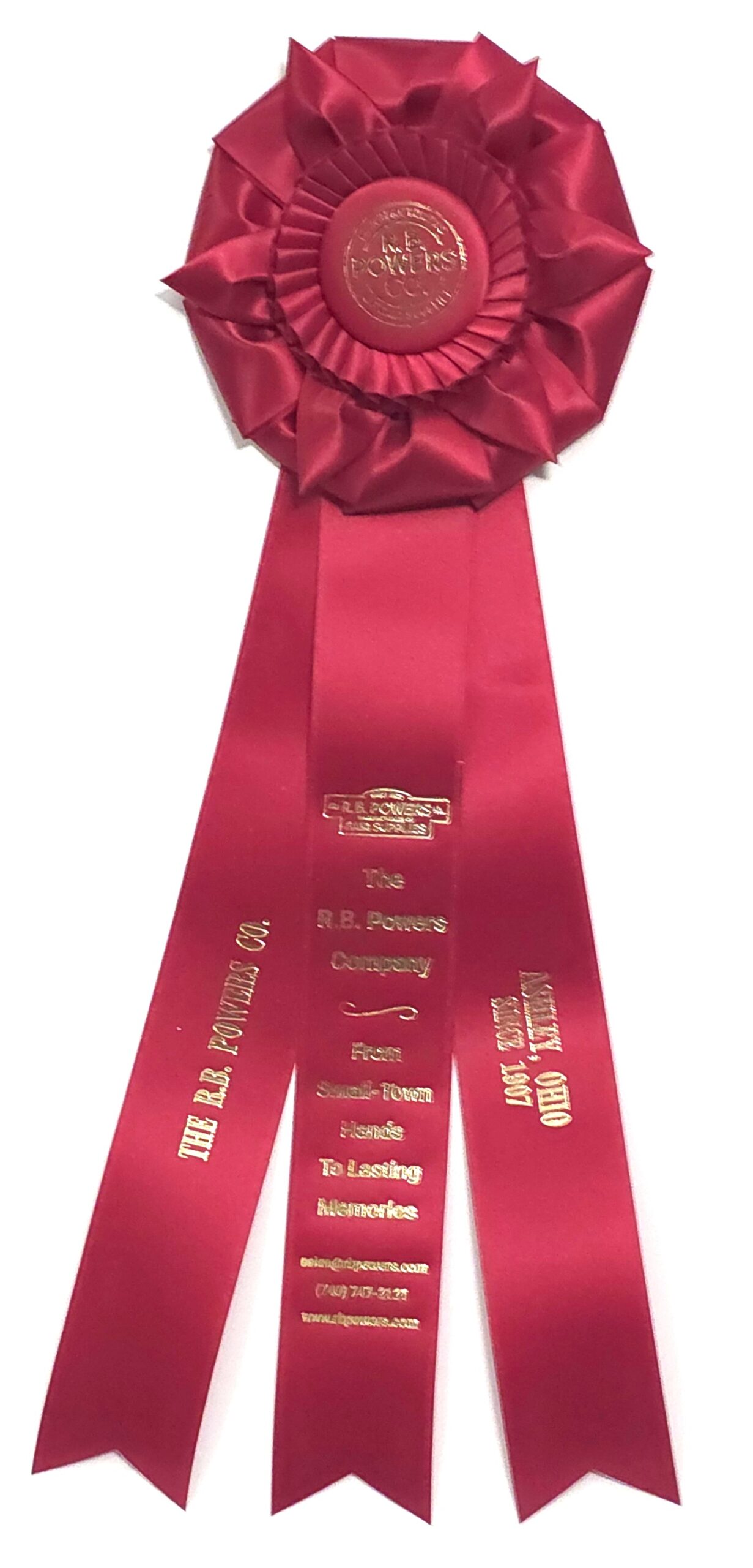 Custom rosette with 6″ rosette head and three 2″ x 15″ streamers. The rosette head has an inner row of quill and an outer row of loops and petals, all surrounding the center button. Total length is 18.5 inches. Your logo (or stock logo of your choice) is printed in the center button.