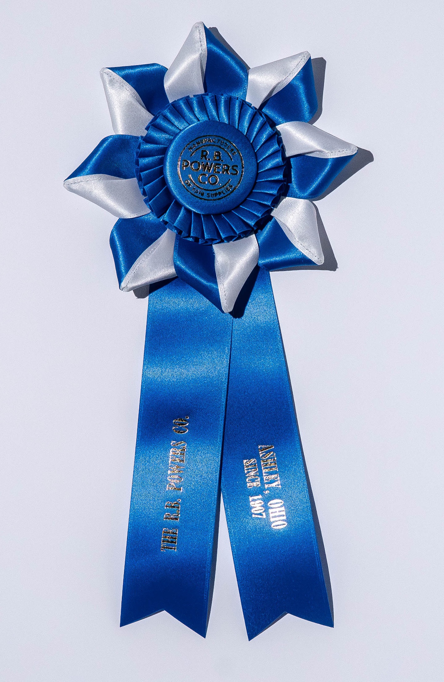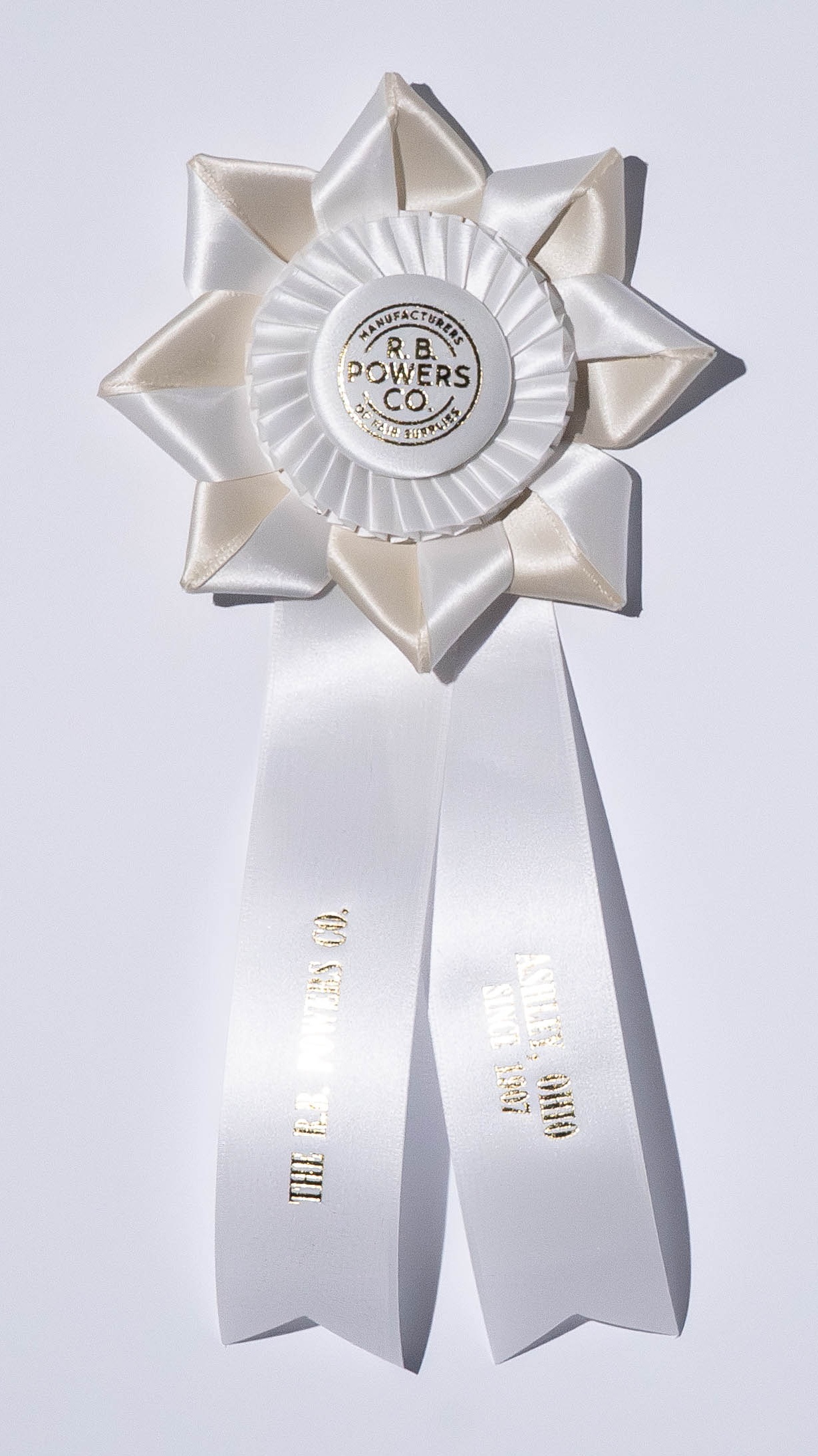 Custom rosette with 5.75″ rosette head and two 2″ x 10″ streamers. The rosette head has an inner row of quill and an outer row of eight petals, all surrounding the center button. Total length is 13.5 inches. Your logo (or stock logo of your choice) is printed in the center button.